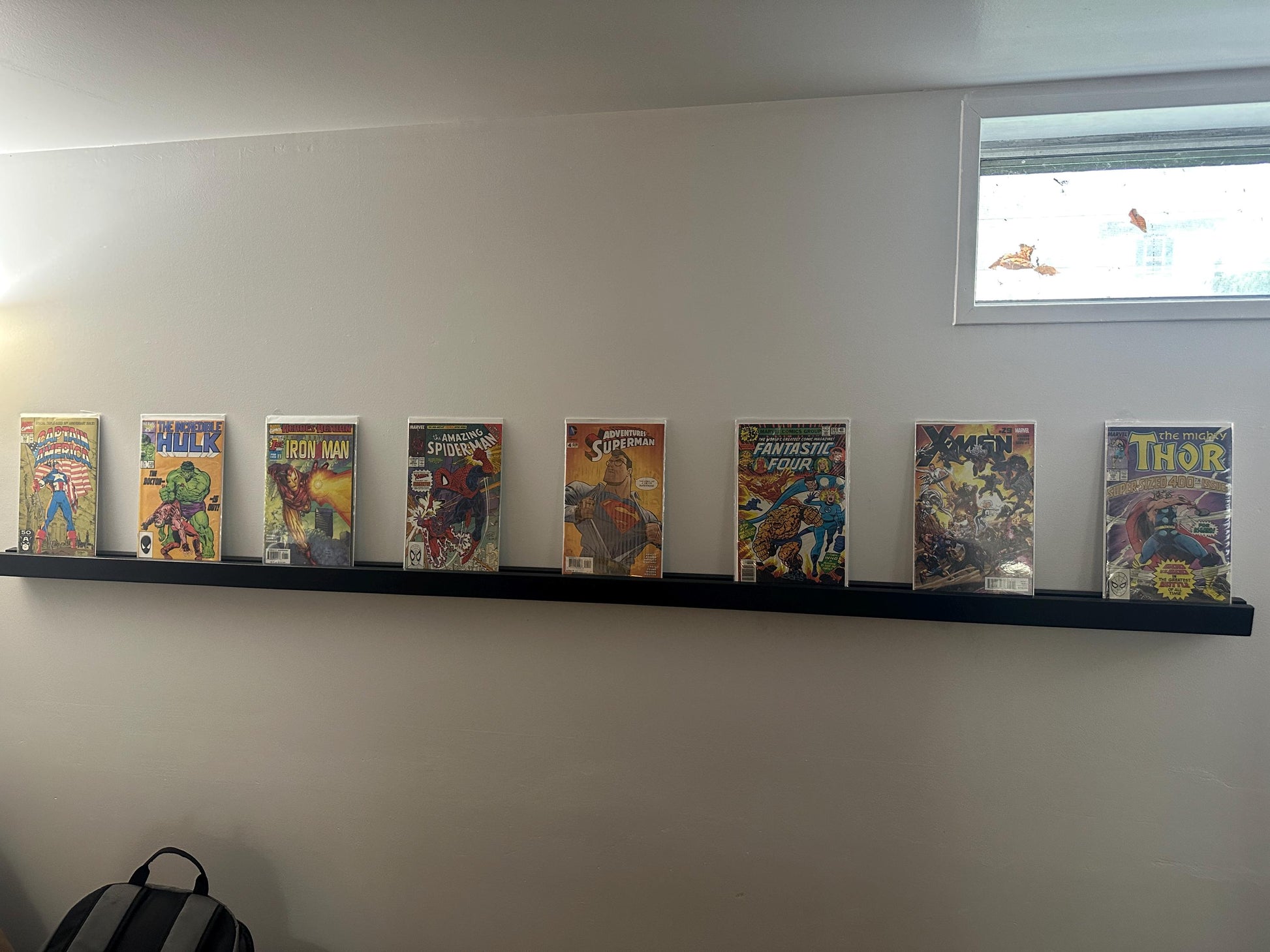 Mount your comic treasures with this handcrafted shelf that keeps them safe and looking sharp. The grooved design cradles bagged, boarded, and CGC-graded comics perfectly, letting them lean back and relax against the wall.